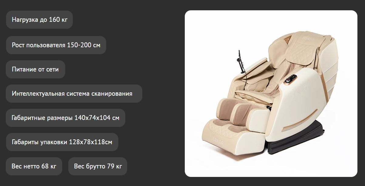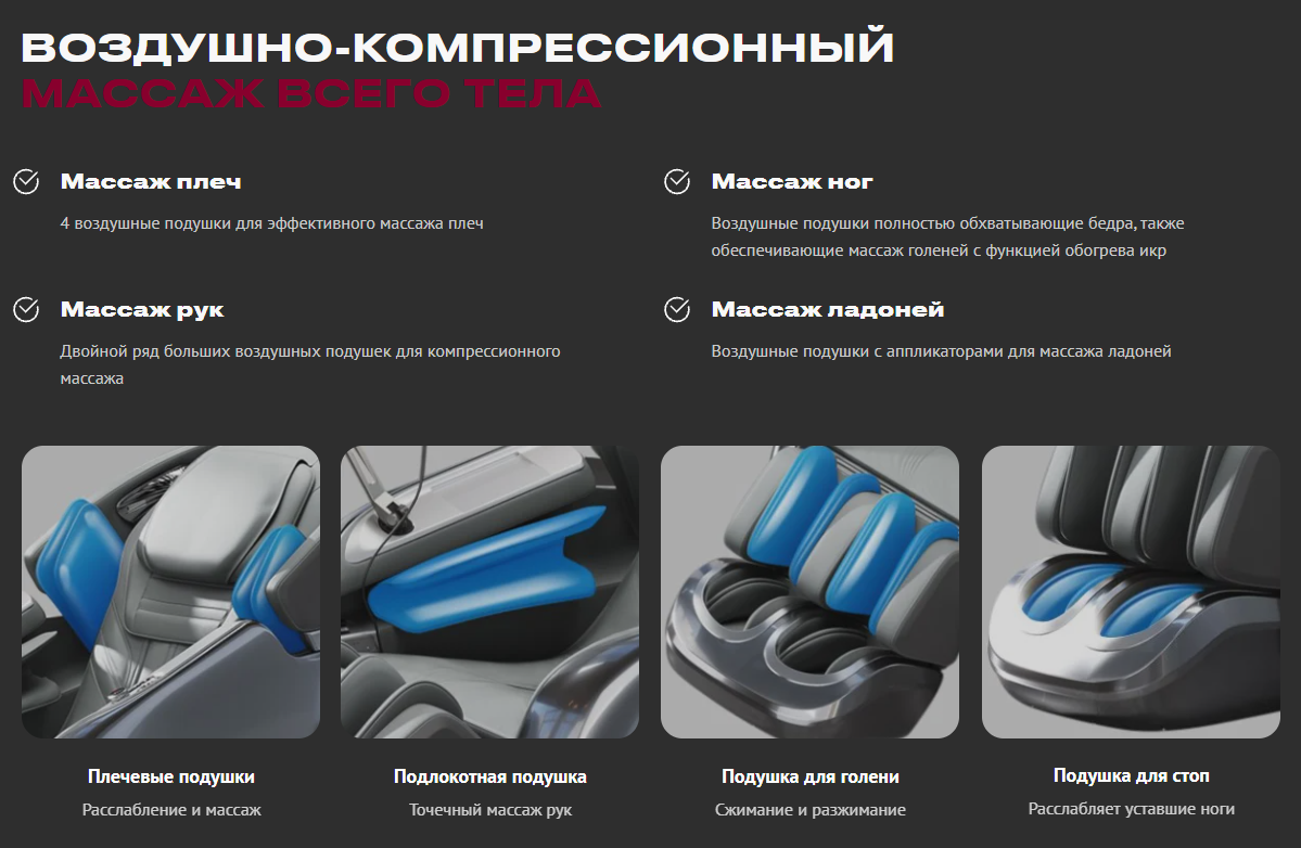 | Зоны массажа | Шея / Спина / Поясница / Плечи / Руки / Бедра / Ягодицы / Икры / Стопы |