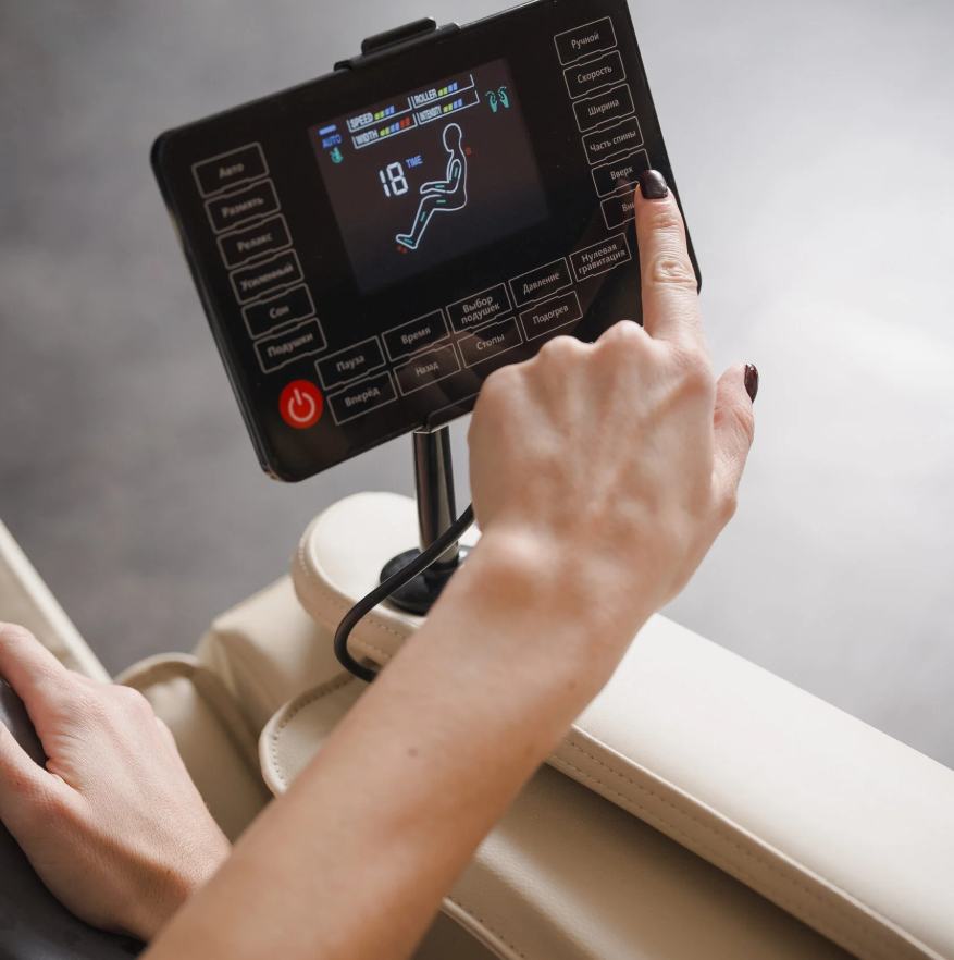 - В кресле установлено 19 воздушных подушек, которые расположены в области плеч, рук, бедер, икр и стоп. Интенсивность давления в подушках можно регулировать