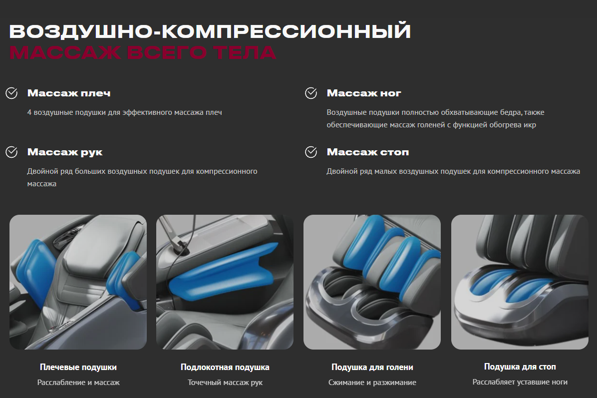 • В кресле установлено 19 воздушных подушек, которые расположены в области плеч, рук, бедер, икр и стоп. Интенсивность давления в подушках можно регулировать