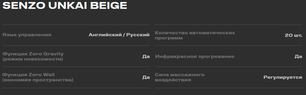 - 2 положения невесомости Zero-G (150° и 176°) для полного восстановления организма, снижения нагрузки на позвоночник и мышцы, эффективного массажа глубоких тканей, улучшения кровообращения и притока кислорода