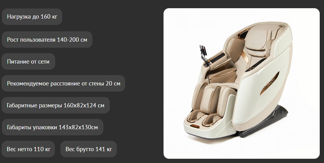 - Улучшенная конструкция кресла создает идеальное положение тела, и в сочетании с передовыми технологиями массажа, каждый сеанс станет незабываемым опытом релаксации и восстановления
