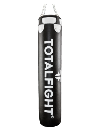 Мешок боксерский набивной TOTALFIGHT Изготовлен из натуральной кожи, дублированной с внутренней стороны тканью ПВХ. Классический черный цвет мешка с добавлением белых прочных вставок, элегантно и надежно закреплённых шестью металлическими клепками, придают изделию запоминающийся строгий стиль. За наружным слоем изделия устанавливается колба из вязкоэластичного ПВВ толщиной 4 см. В горловину мешка, по периметру, с внутренней стороны вшит металлический обруч из полосы металла. Кроме прекрасных амортизационных характеристик поглощения энергии удара, такая конструкция отлично держит форму на протяжении всего времени эксплуатации, предотвращая осыпание набивки и провисания мешка. Система подвеса: полукольца, цепи, карабин.