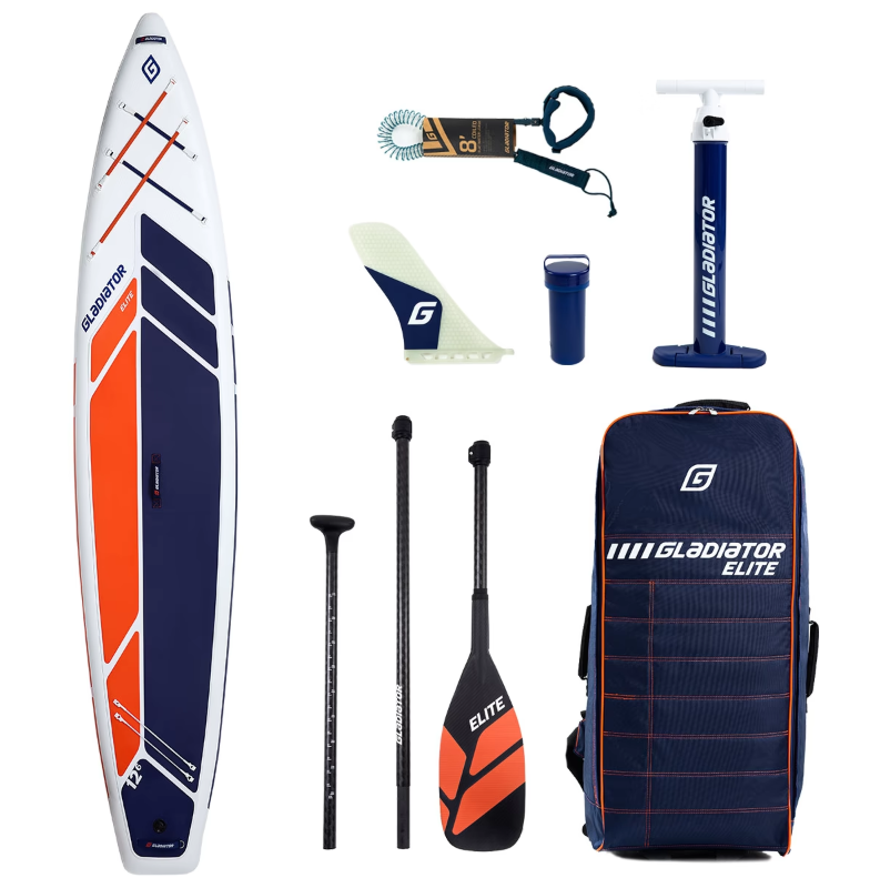 SUP Gladiator Elite 12'6LT укомплектован стильной и вместительной сумкой на колесиках, итальянским насосом двойного действия, оснащенным манометром, отличным лишем, разборным карбоновым веслом и ремкомплектом.