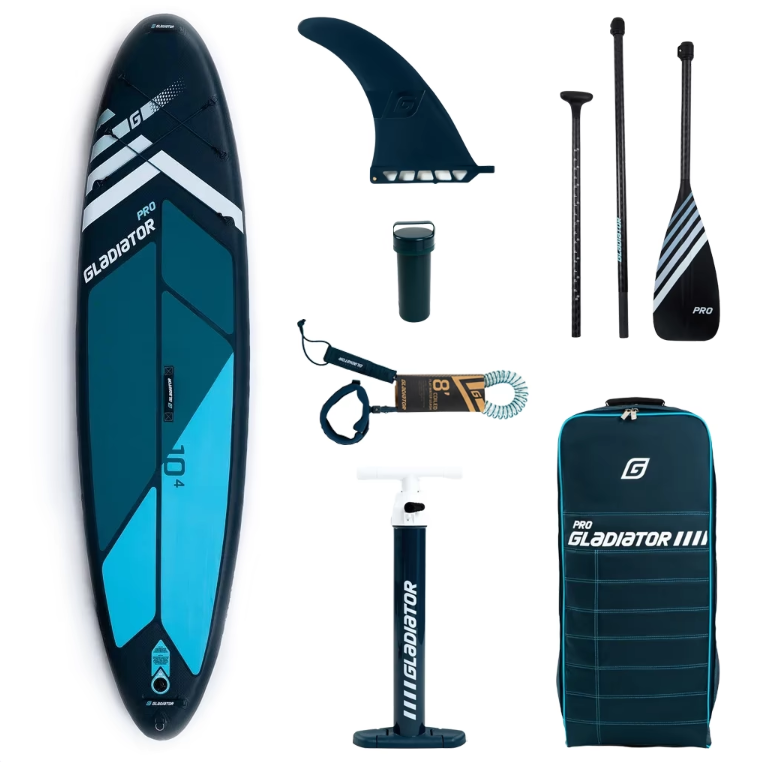 В комплекте с Gladiator Pro 10'4 есть все необходимое — удобная вместительная сумка на колесиках, итальянский насос двойного действия, разборное весло с карбоновым шафтом и лопастью из фибергласса, качественный лиш и ремкомплект.