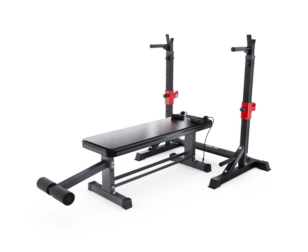 Прямая силовая скамья со стойками под штангу DFC D2031TJ07 — идеальный выбор для домашних тренировок! Скамья выдерживает активные нагрузки до 277 кг, что помогает использовать её как новичкам, так и профессиональным спортсменам. Тренажер позволяет легко выполнять различные упражнения, включая жим лежа, жим от плеч, приседания, подъемы над головой, упражнения со штангой, отжимания на брусьях, подтягивания, отжимания, что делает его универсальным.