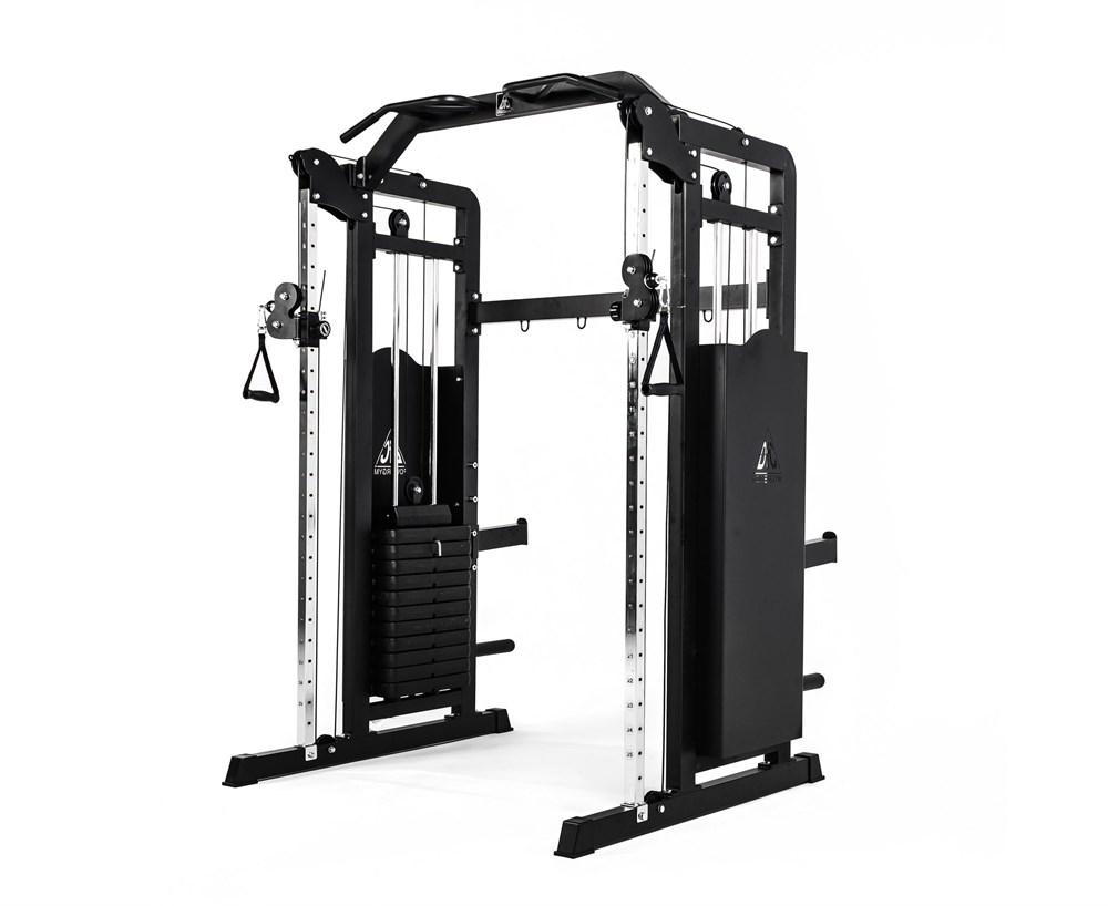 Кроссовер изготовлен из высококачественного стального профиля размером 50 х 50 и 50 х 75 мм. Толщина 1,5 мм. Диаметр тросов 4 мм. В качестве нагрузки используются 2 встроенных стека общим весом 163 кг: по 81,5 кг каждый.