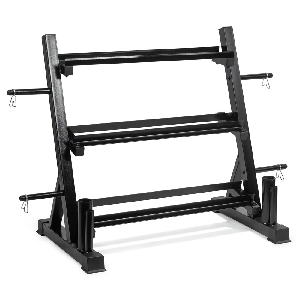 Многоуровневое хранение – три полки для гантелей разного веса, а также держатели для дисков и грифов.