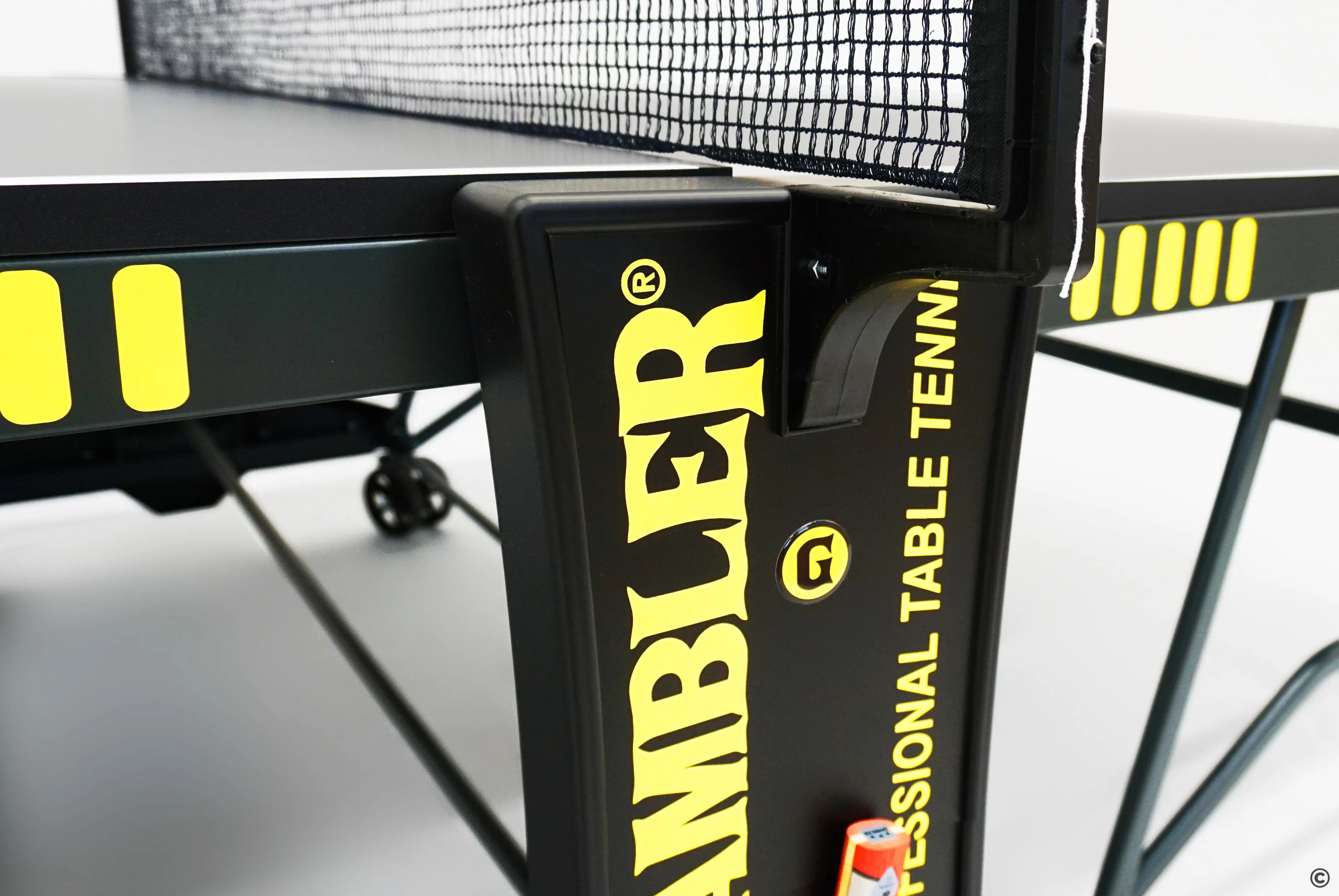 Комплектация стола включает встроенную сетку с натяжным механизмом и боковые накладки, предназначенные для хранения ракеток и мячей.