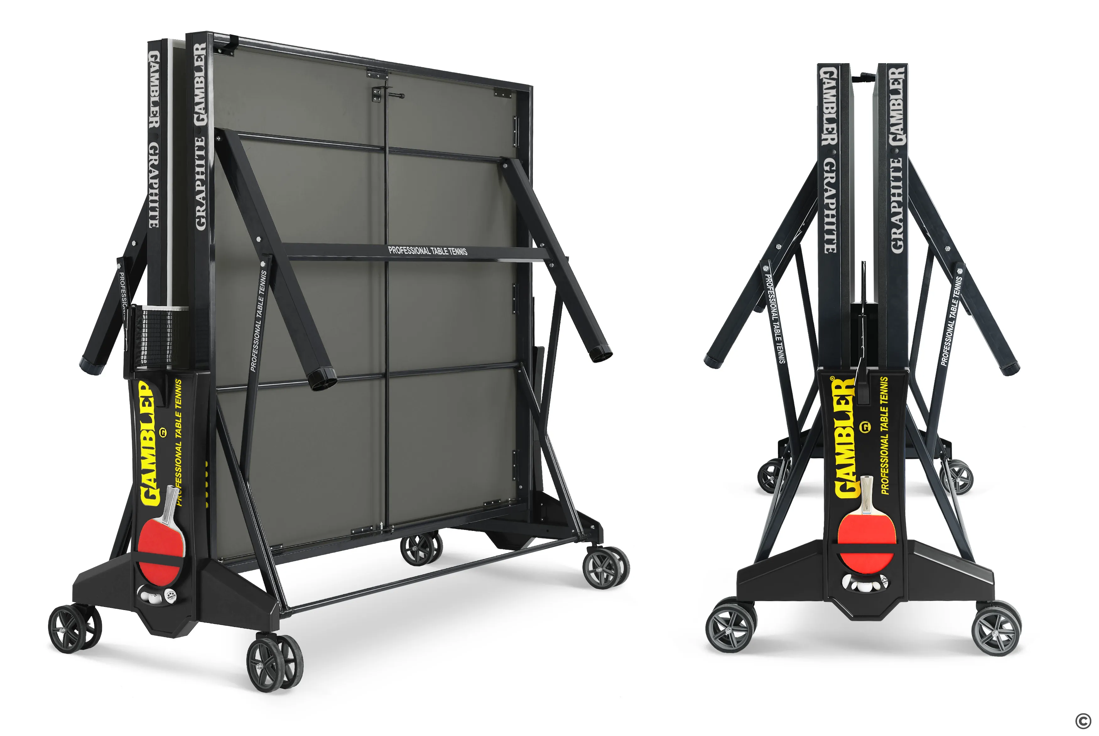 Конструкция оснащается уникальной системой складывания, которая фиксирует теннисный стол в сложенном и разложенном виде.