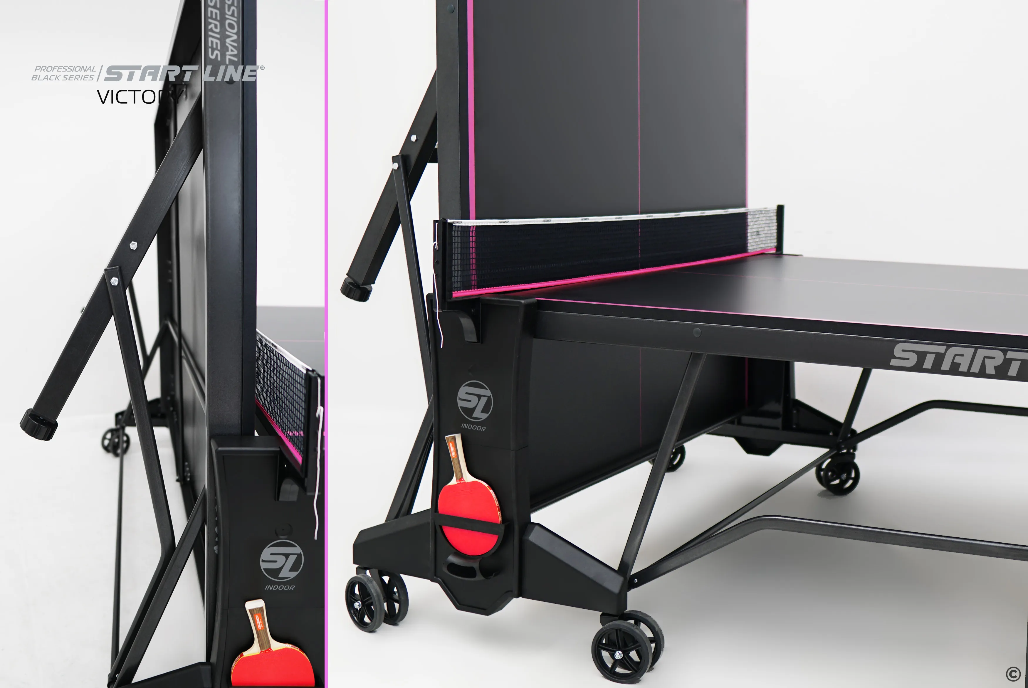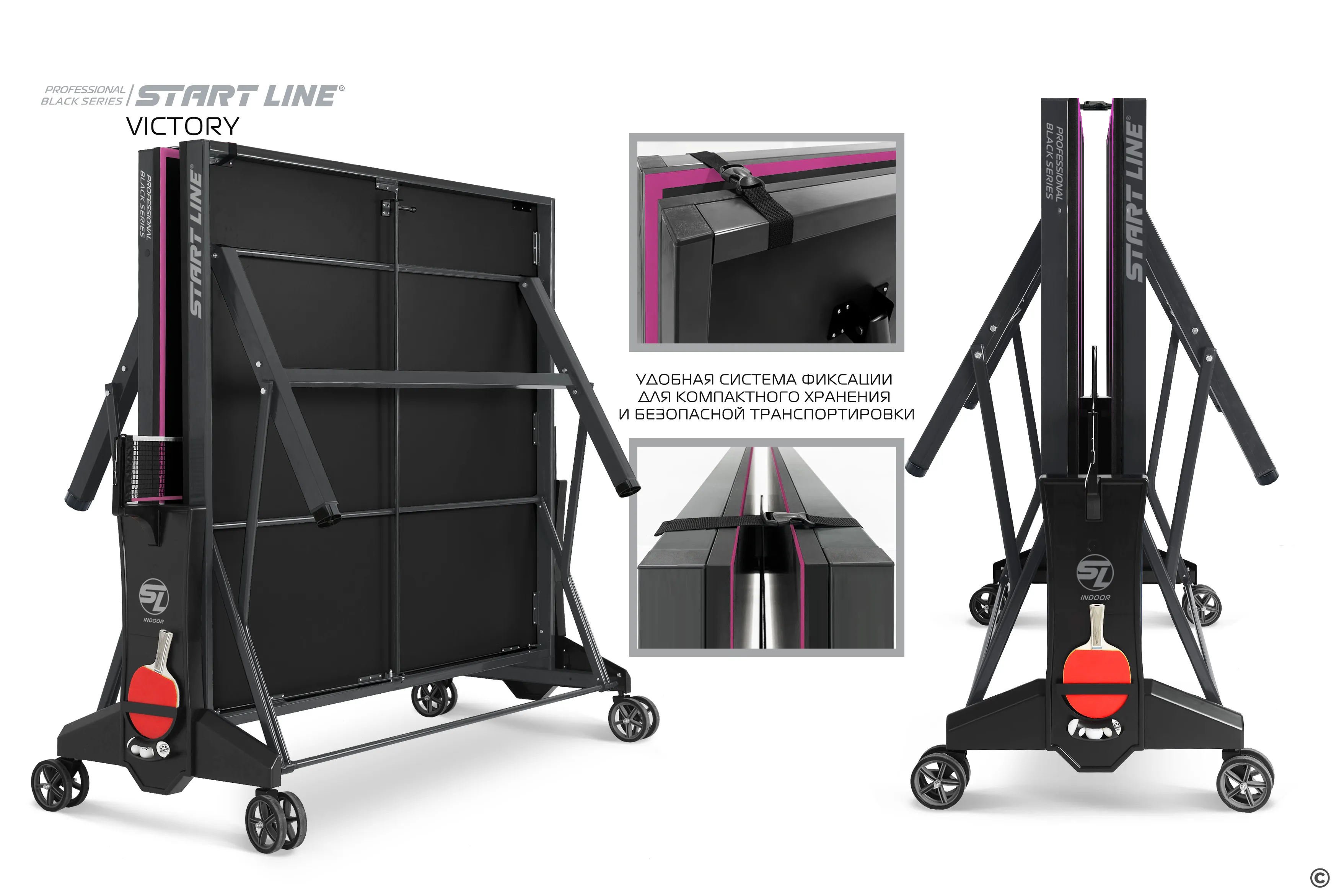 Комфортная система складывания стола является собственной авторской разработкой Start Line. Она предусматривает усовершенствованный механизм, позволяющий быстро и надежно закрепить положение стола как в разложенном, так и в сложенном виде. Все манипуляции производятся с рабочего места игрока для каждой из столешниц. С такой системой складывания легко справляется один человек, а стол при хранении занимает минимум пространства. Дополнительная фиксация стола в сложенном виде позволяет просто и безопасно транспортировать стол. Конструкцией предусмотрен режим одиночной игры PLAYBACK для самостоятельной проработки точности ударов.