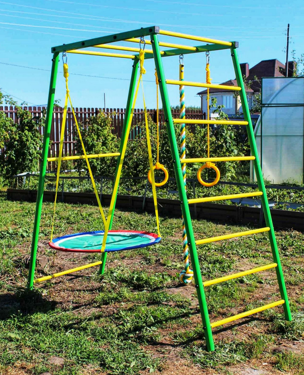 Комплектация: кольца гимнастические, качели-гнездо, канат, рукоход, шведская стенка.